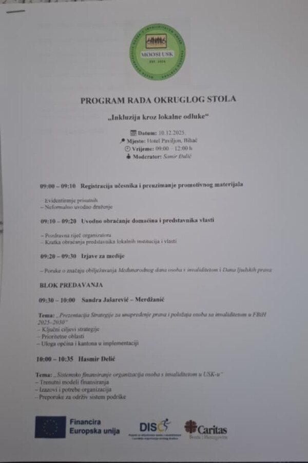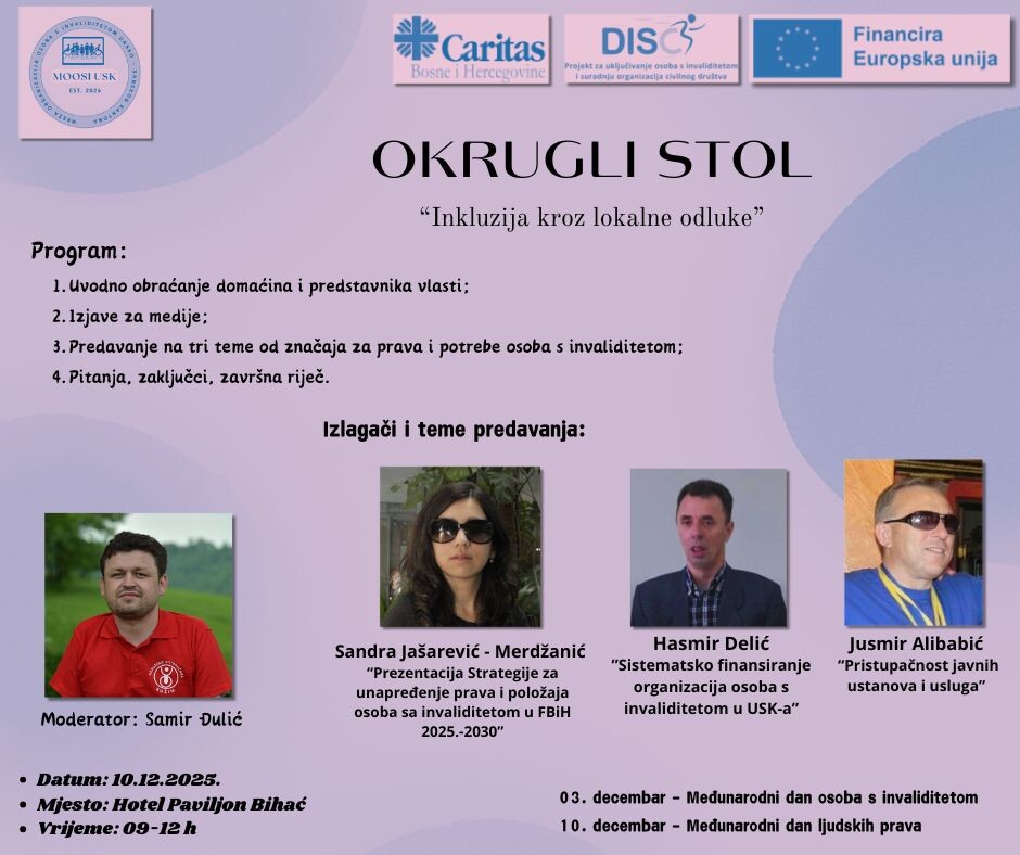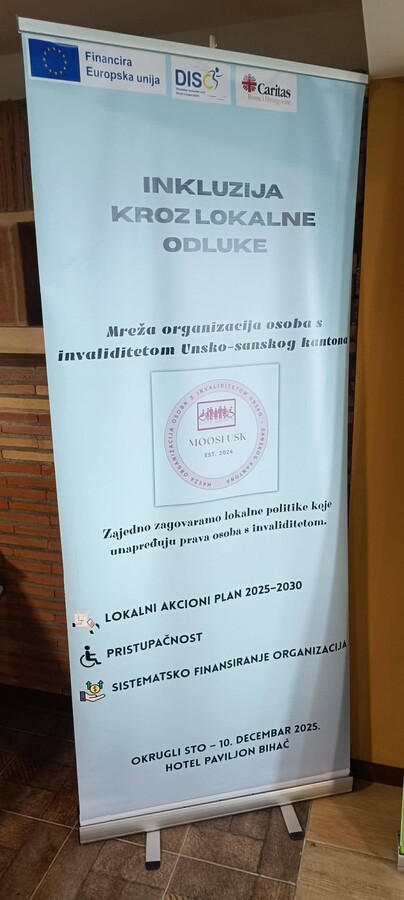 U hotelu „Paviljon“ u Bihaću 10. decembra održan je okrugli sto pod nazivom „Inkluzija kroz lokalne odluke“, koji je organizovala Mreža organizacija osoba s invaliditetom Unsko-sanskog kantona (MOOSI USK). Događaj je okupio predstavnike organizacija osoba s invaliditetom, lokalnih institucija, medija, stručnjake iz oblasti prava osoba s invaliditetom, te predstavnike OSCE-a.