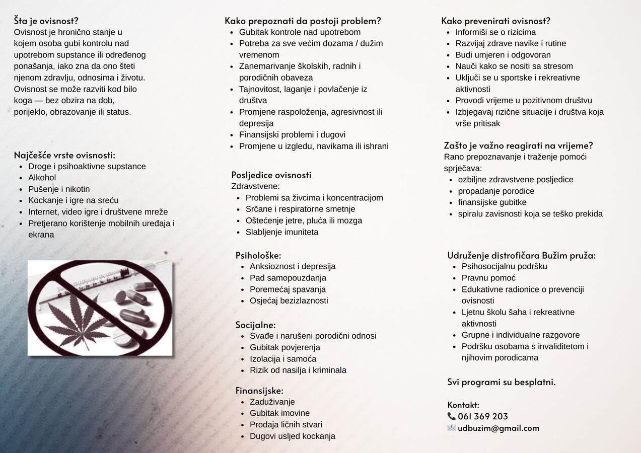 Udruženje distrofičara Bužim uspješno je implementiralo projekat „Zajedno u borbi protiv ovisnosti – Okreni leđa ovisnosti“. Kroz projekat su realizovane brojne aktivnosti usmjerene na prevenciju i borbu protiv ovisnosti kod osoba s invaliditetom, uključujući sportsko-rekreativne, edukativne, socijalne i zdravstvene sadržaje. Poseban fokus bio je na podizanju svijesti o štetnosti ovisnosti, jačanju zdravih životnih navika i pružanju direktne podrške članovima udruženja i drugim osobama s invaliditetom.